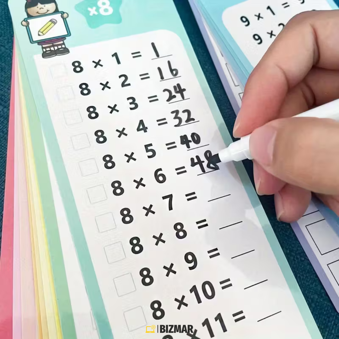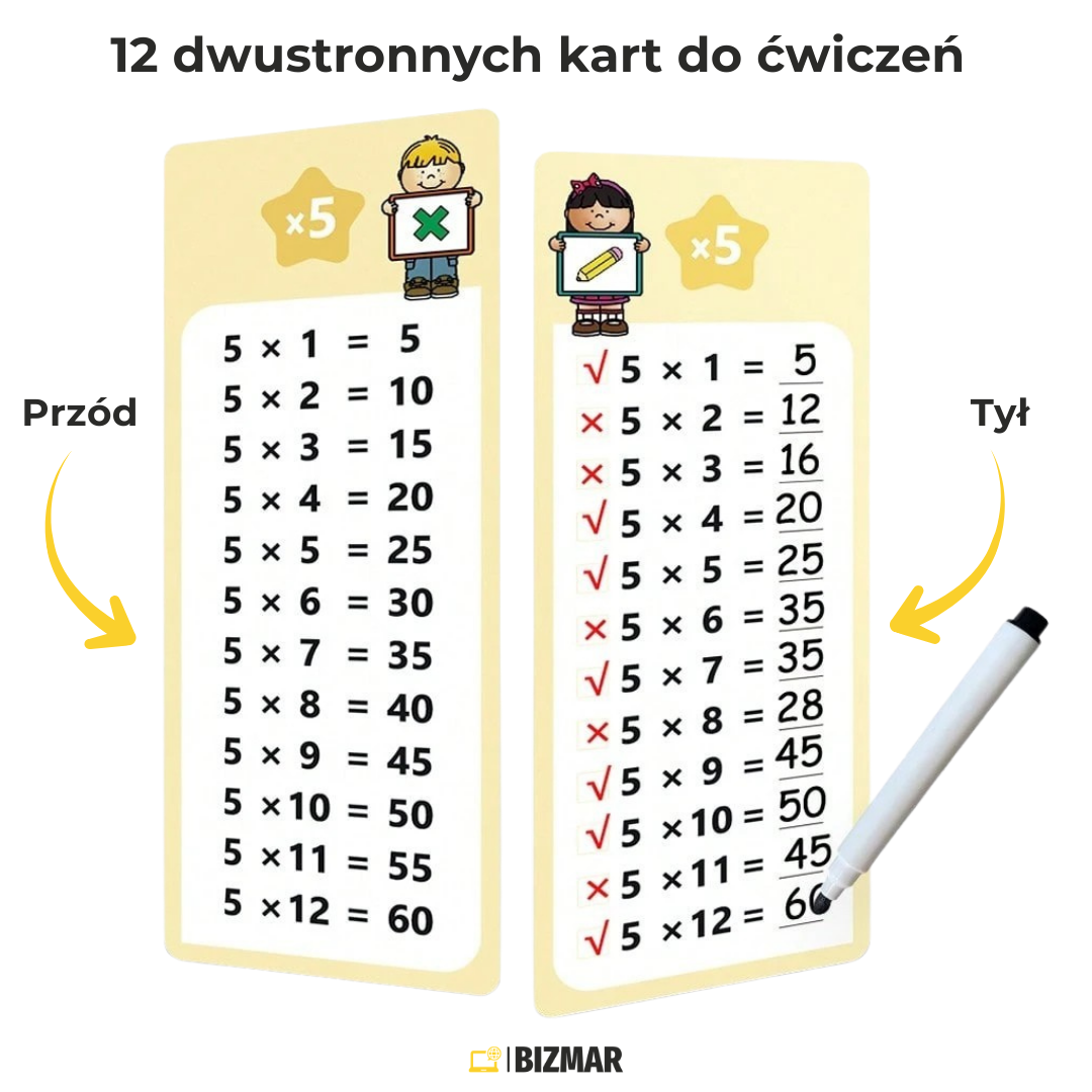 ✅ 13 Kart Treningowych (Dwustronnych): Fundament mnożenia (0-12). Z jednej strony dziecko wpisuje wynik, a po odwróceniu karty natychmiast go sprawdza. To uczy samodzielności – błąd nie jest porażką, bo można go od razu zmazać i poprawić!